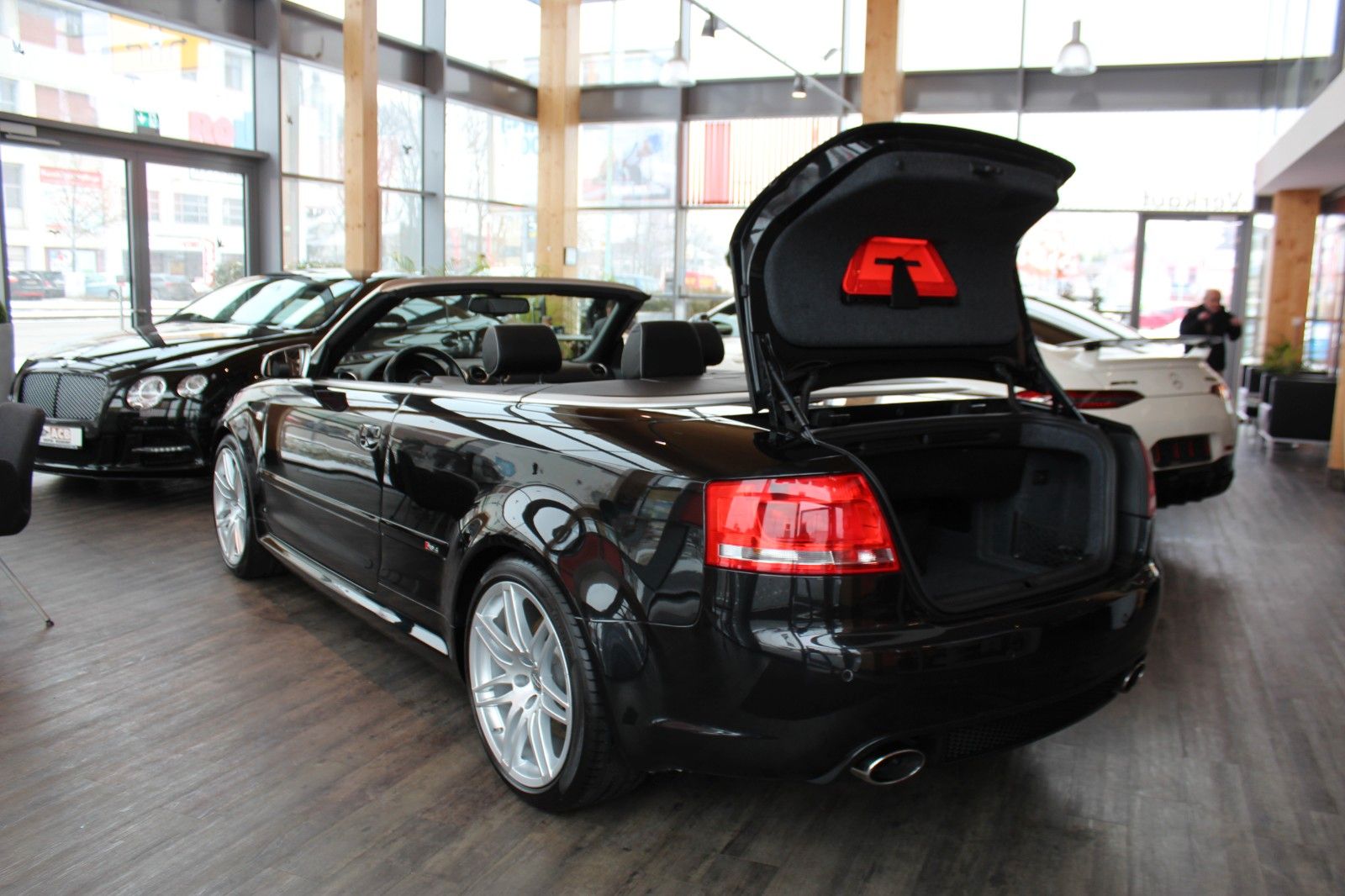 Dekor Carbon-Einlagen, Sportabgasanlage ab Werk, Höchstgeschwindigkeit 280 km/h abgeregelt, Carbonpaket Motorraum, RS-Sportlenkrad unten abgeflacht, vollelektrisches Akustikverdeck (öffnen/schliessen bis 30 km/h), Lederausstattung Seidennappa schwarz mit Keder weiß, Sitzheizung vorn und hinten, Isofix vorn und hinten, Außenspiegel elektr. klappbar & mit Abblendautomatik, CD-Wechsler im Handschuhfach, Innenspiegel mit Abblendautomatik, Kühlbox im Handschuhfach, LM-Felgen 9x19 7-Doppelspeichen der quattro GmbH, MMI inkl Musik-Steuerung vom Handy über Bluetooth, Navigation Plus, Sound-System BOSE, Sport-Fahrwerk RS-DRC, elektrische Sportsitze mit Memory, Vorrüstung Mobiltelefon/Handy mit Bluetooth-Schnittstelle in Mittelarmlehne integriert, Windschott, Perleffekt-Lackierung, Bi-Xenonlicht, Easy-Entry, Skisack inkl. Durchreiche, Individualeinbauten der quattro GmbH u.v.m. ...